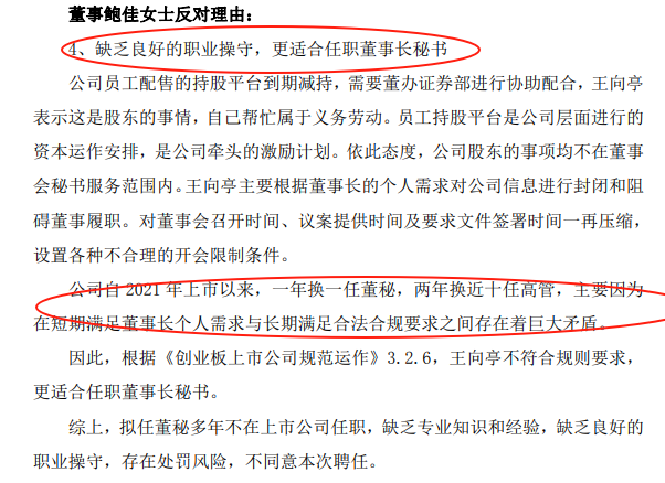 鲍佳在董事会上指出,王向亭2021年离开原任职上市公司责任于今已脱离上市公司证券责任多年,不熟习上市公司规矩,笨重必要的实操造就,需要依赖证券部共事完成责任。董事会文献屡次出错、贯串修改,同期存在修改后不邂逅告董事的情况。在年度敷陈关连来去审议阶段,董事屡次向其阐述关连来去占净财富的审议步调,王向亭均示意为总财富的50%才需要审议,专科才调存疑。